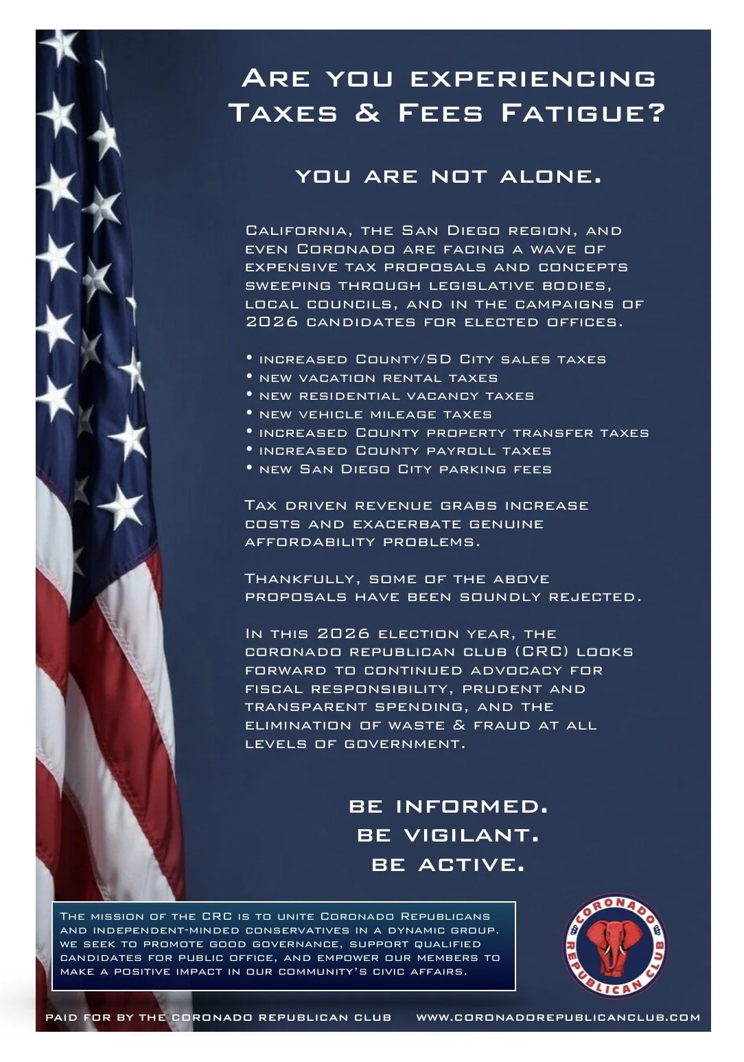 The Mission of the Coronado Republican Club (CRC) is to unite Coronado Republicans and independent-minded conservatives in a dynamic group. Guided by our principles and values, we promote good governance, support qualified candidates for public office, and empower our Members to make a positive impact in our community's civic affairs.