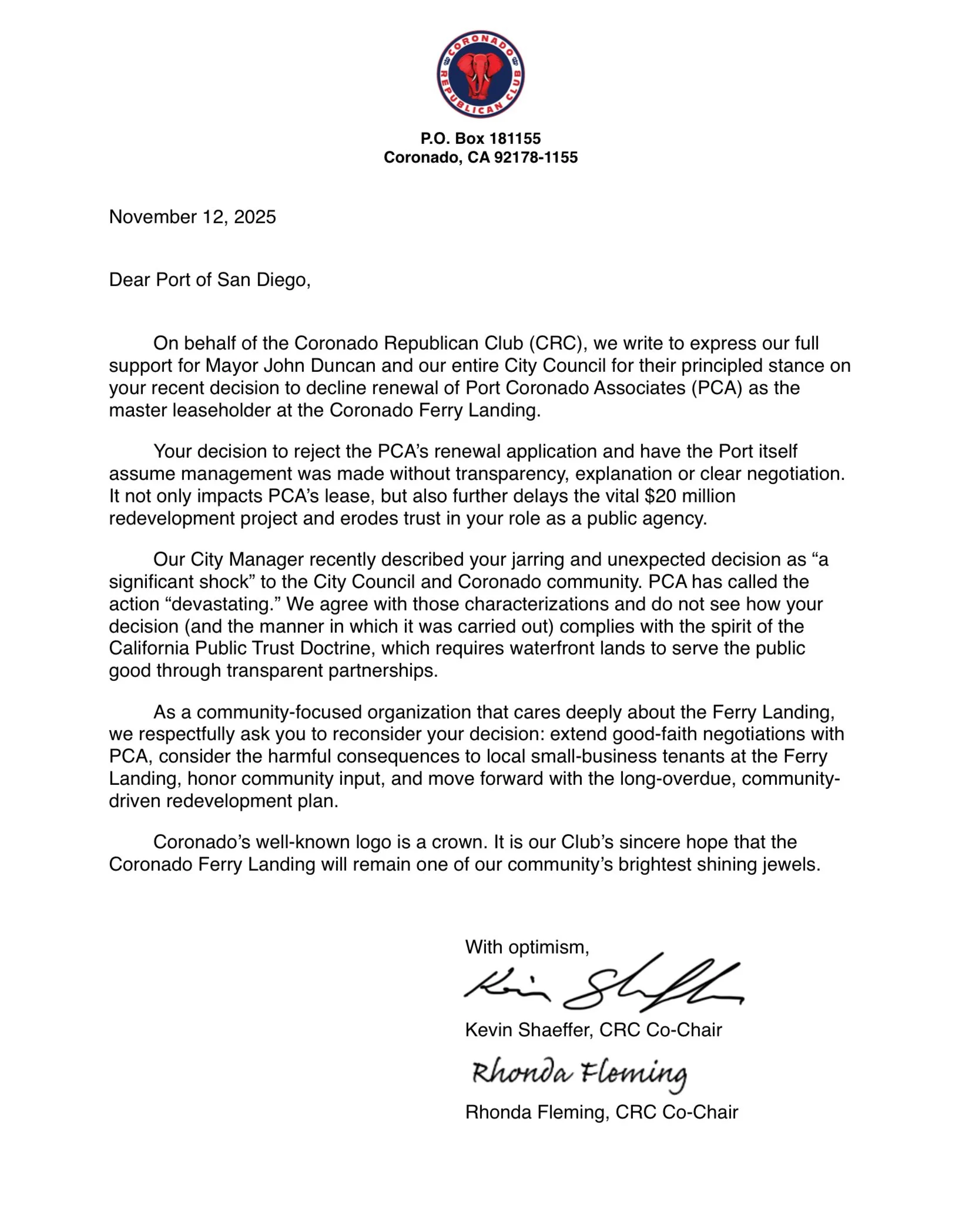 On behalf of the Coronado Republican Club (CRC), we write to express our full support for Mayor John Duncan and our entire City Council for their principled stance on the recent jarring decision by the Port of San Diego to decline renewal of the master lease at the Coronado Ferry Landing, held by Port Coronado Associates (PCA).